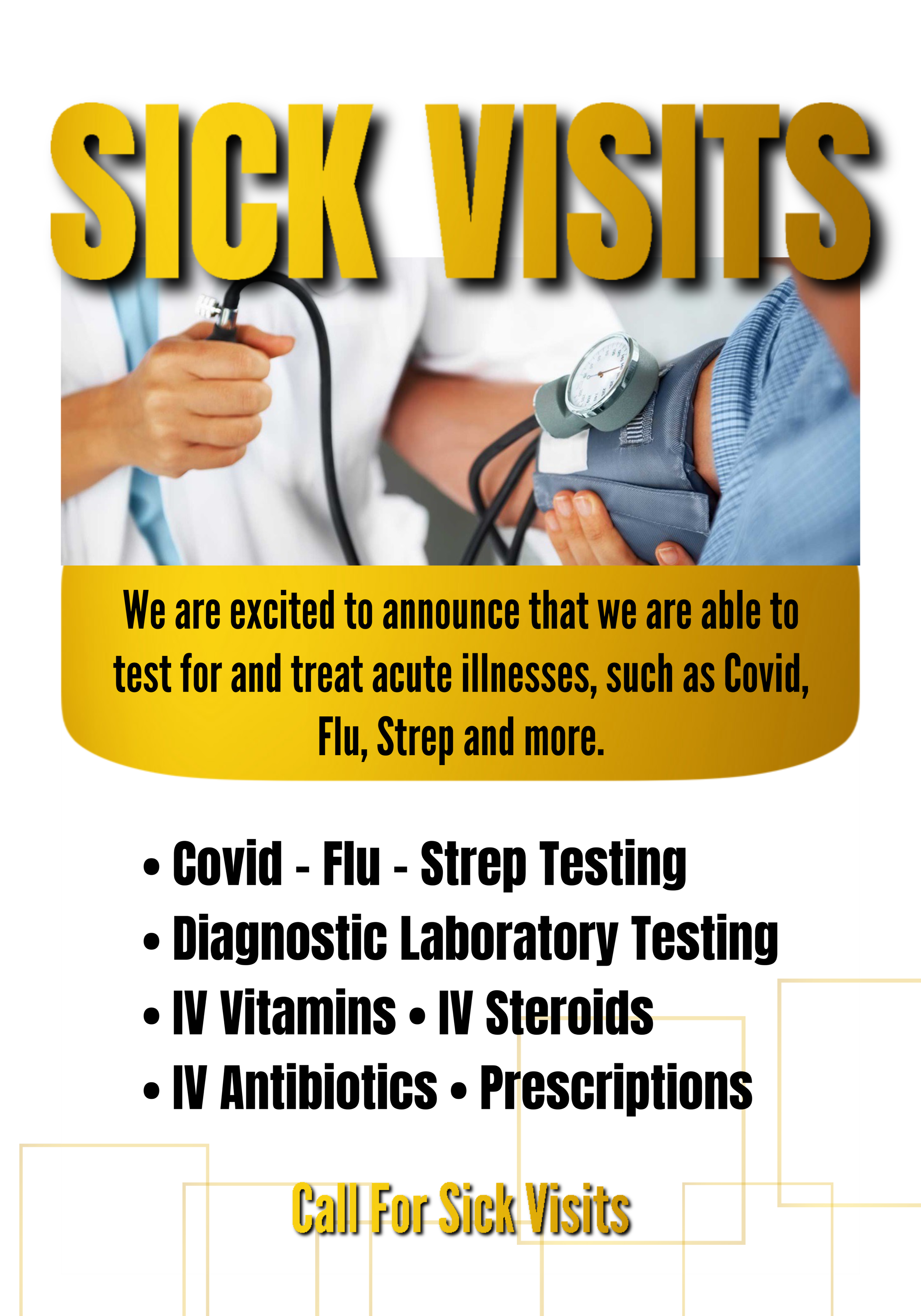 If you are experiencing Cold/Flu like symptoms, dehydration, nausea, vomiting, sore throat, fatigue, or covid symptoms, give us a call. We can test for and treat these type of illnesses without a $2,000 ER Bill. Our Medical Director will see you via Telehealth and come up with a treatment plan for you. We have IV antibiotics, IV steroids, medication for nausea and aches. The best part is, there are no crowded waiting rooms. Call to set up an appointment and come right in for treatment.